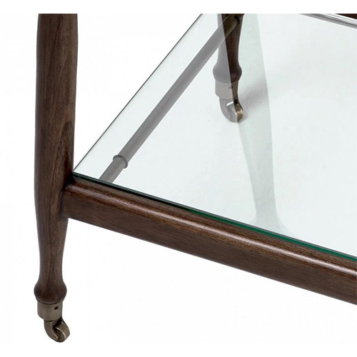 Элегантная тележка в классическом коричневом исполнении с прозрачной стеклянной столешницей.